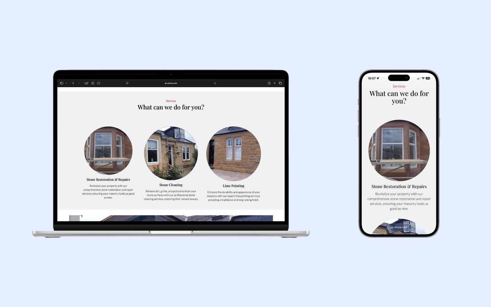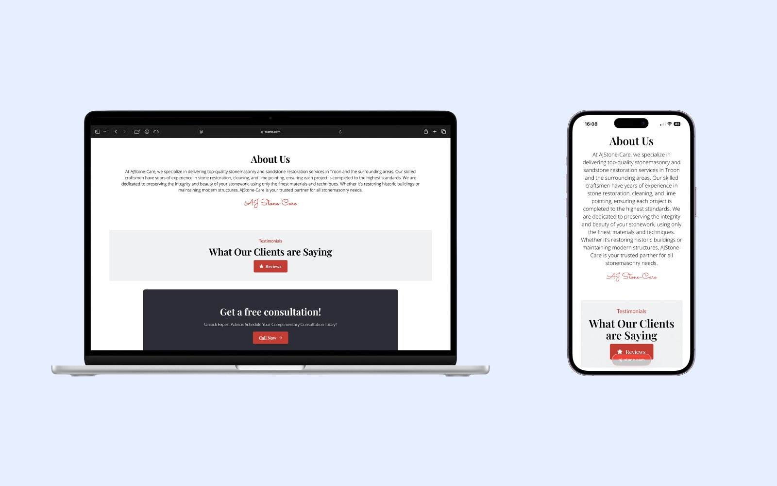 AJ Stone-Care wanted a simple website so local homeowners could search, find them in Troon, and get in touch quickly. Competitors nearby were already winning work just by having a website, and AJ cared a lot about showing reviews on the page to prove the quality behind the work.