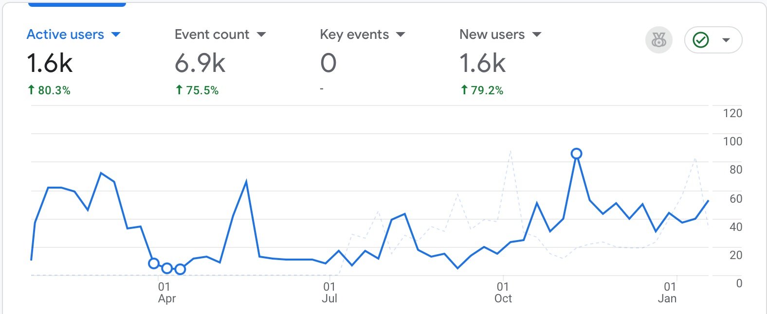 Over the last 12 months the site brought in 1.6k active users, up 80.3% year-on-year, alongside 1.6k new users (up 79.2%). Active users are engaged visitors - people who actually interact with the site (viewing pages, clicking buttons, spending time) - which is the type of traffic that turns into real local enquiries.
