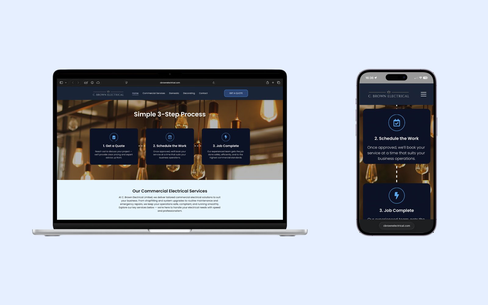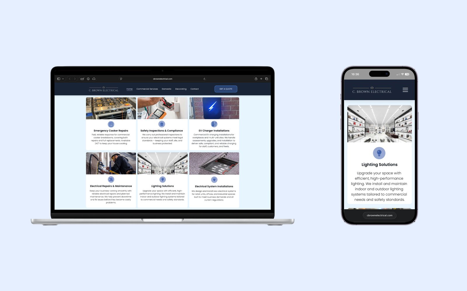 C. Brown Electrical now has a website that looks and reads like a proper commercial contractor: clear local positioning, strong proof, and a contact flow built for fast decisions. The result is a site that attracts more serious enquiries and makes it simple to request a quote.
