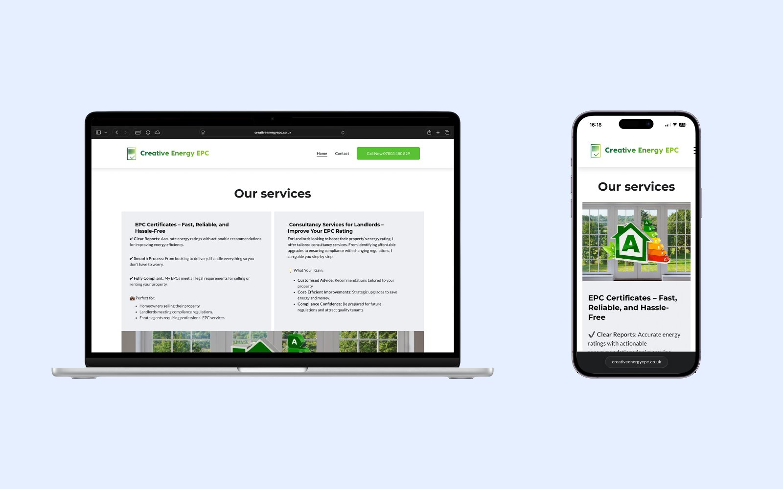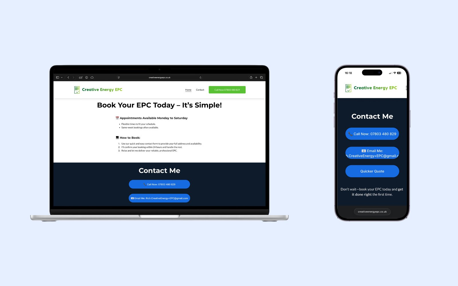 Creative Energy needed a website that made EPC booking feel simple and reliable. The priority was trust (accreditation + reviews), clarity (what an EPC is and who needs it), and speed (clear contact options on desktop and mobile).