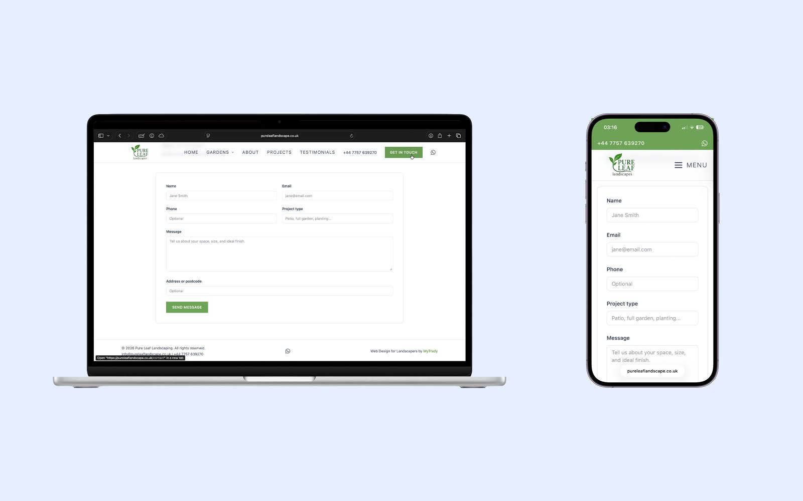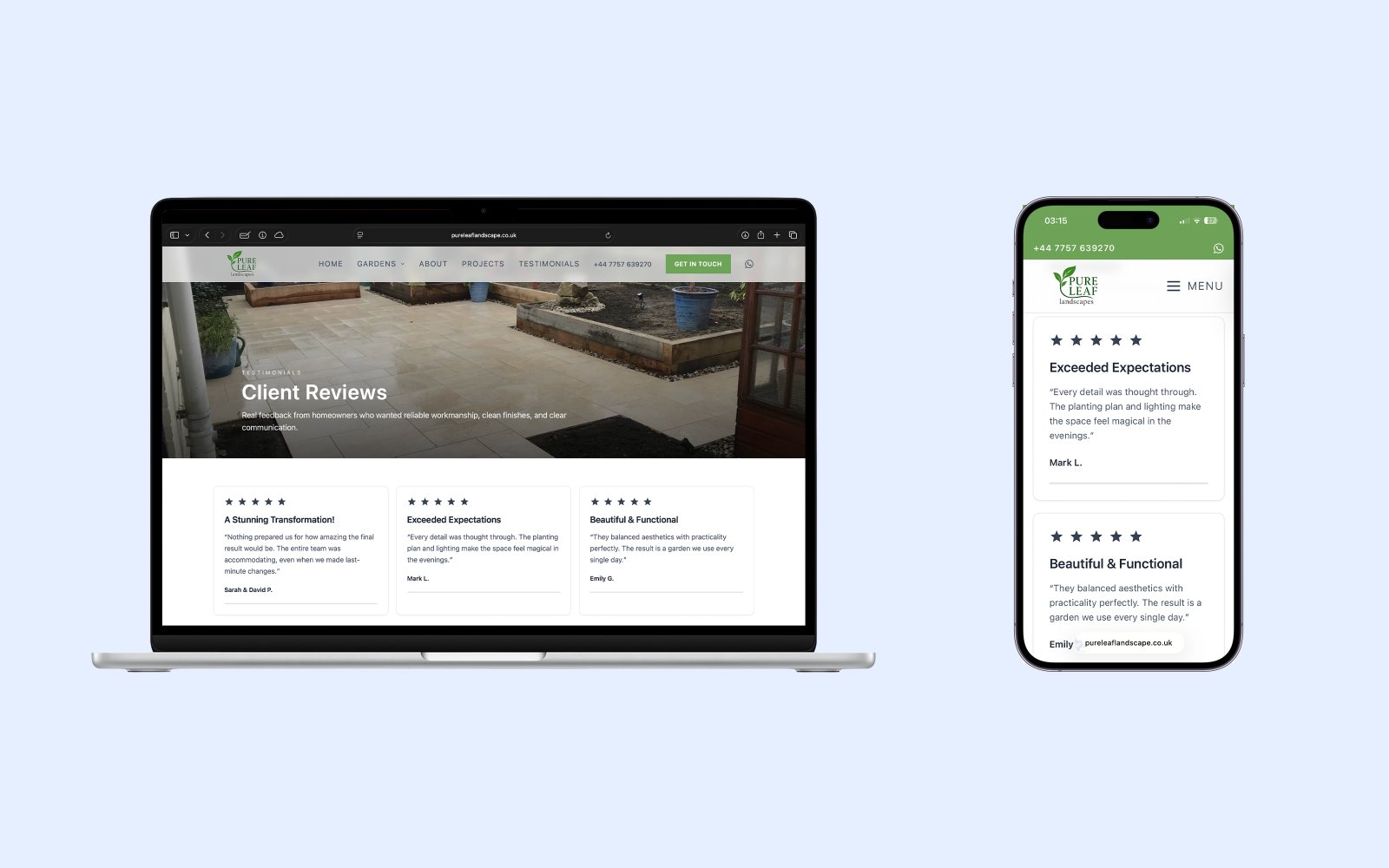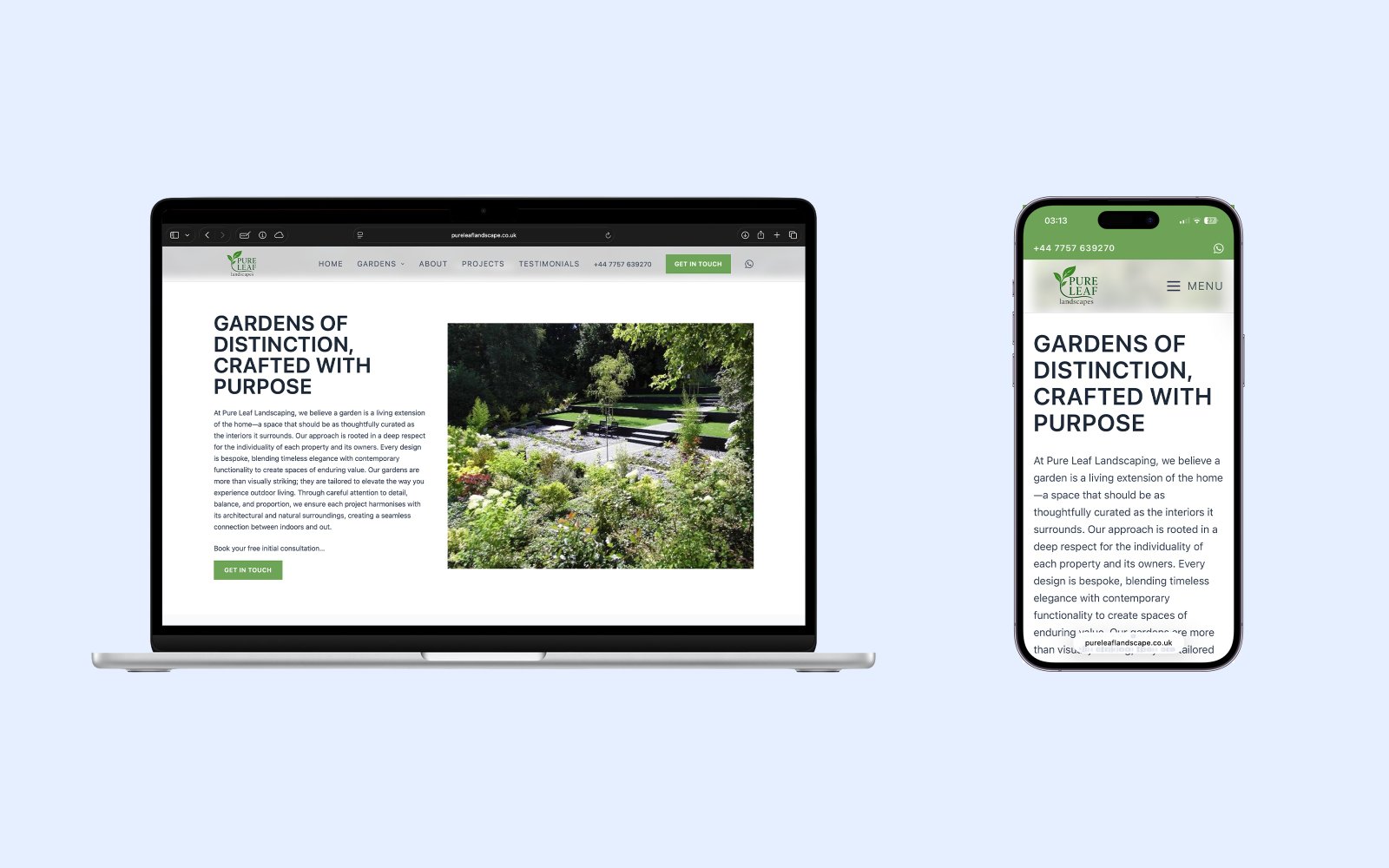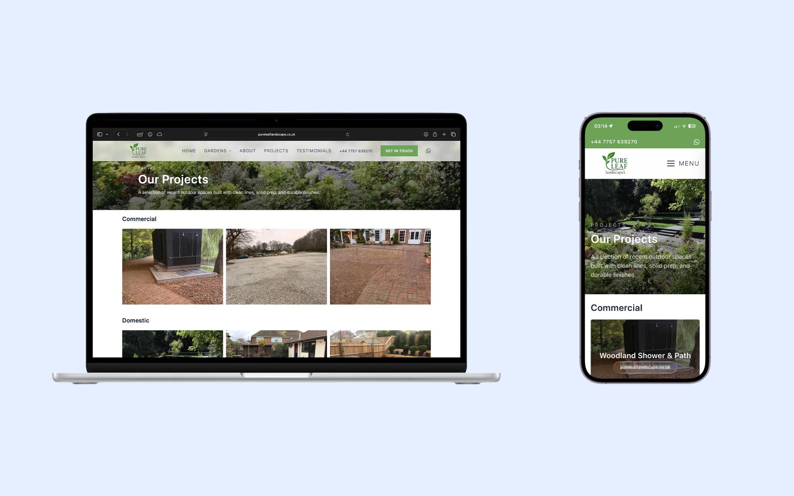 We rebuilt Pure Leaf’s site to sell what actually wins landscaping work: premium visuals, clear coverage, a construction-led message, proof from real projects, and a simple “Get in touch” flow that works perfectly on mobile.