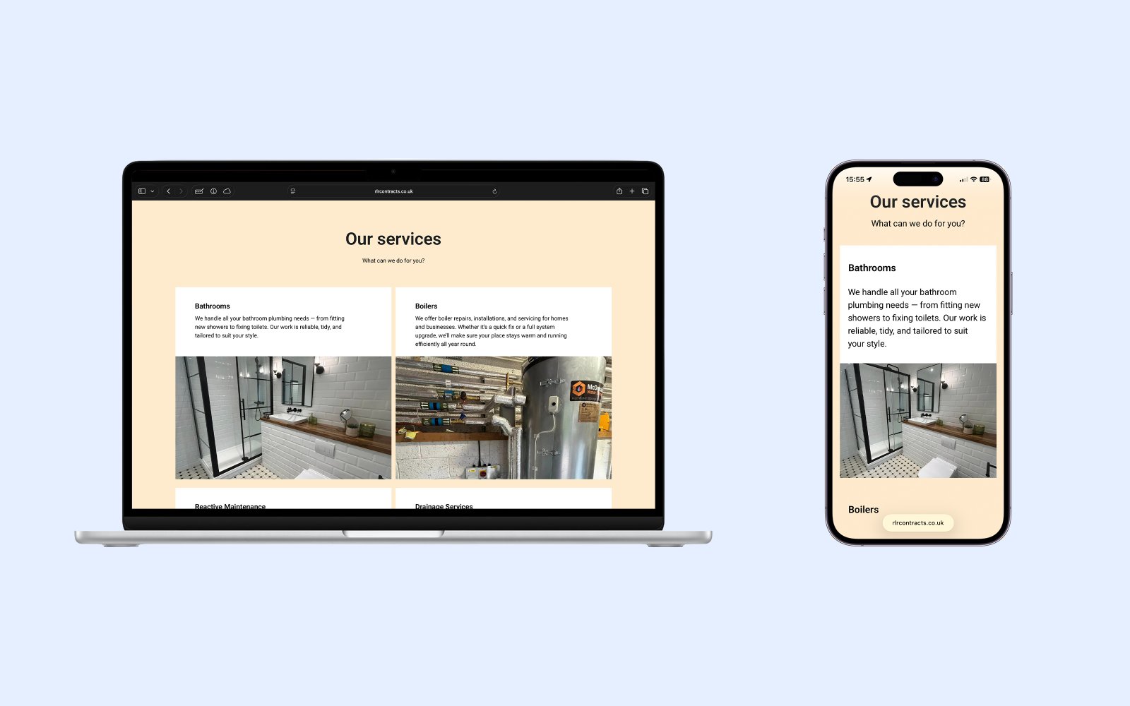 Instead of a wall of text, we structured services into clear sections so visitors quickly find their job type - boilers, bathroom plumbing, drainage, reactive maintenance - and move straight to contacting.