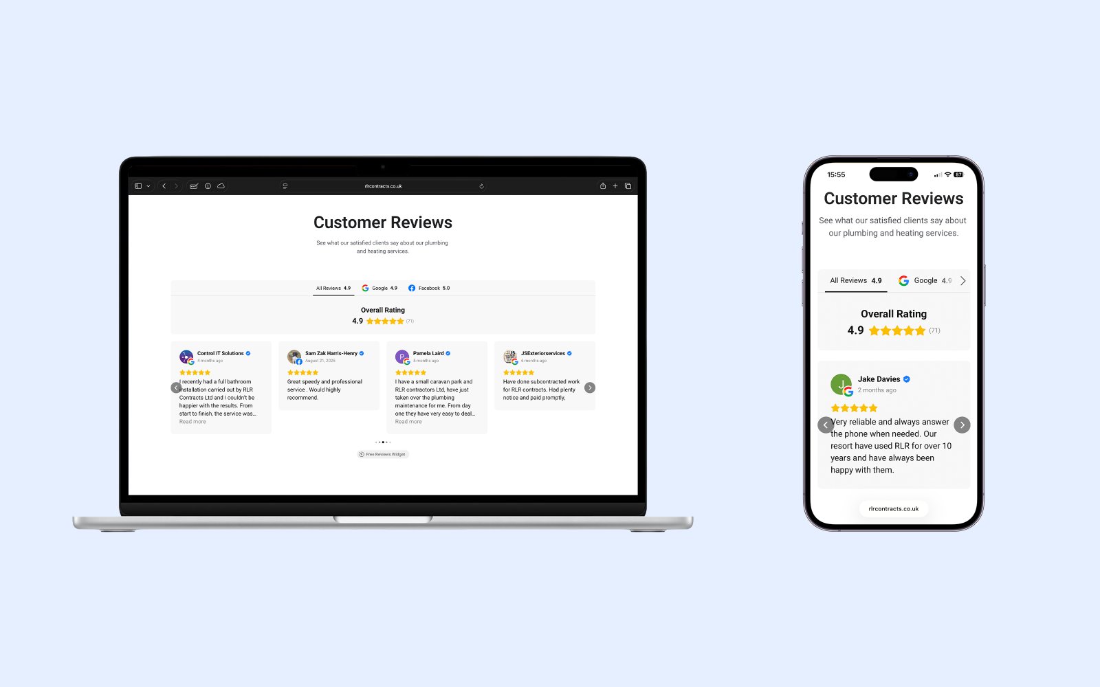 Plumbing and heating is all trust. We made reviews a core part of the page flow, showing a strong overall rating (4.9) and a high volume of feedback (71) so customers feel safe choosing RLR before they even pick up the phone.