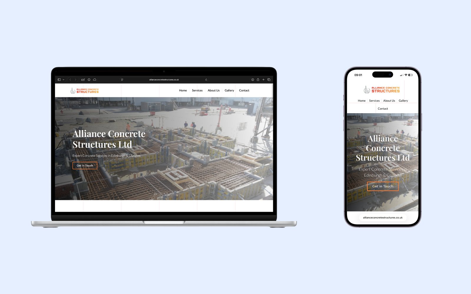 A sample homepage hero showing a concrete specialist site with prep, pour, and finish details upfront.