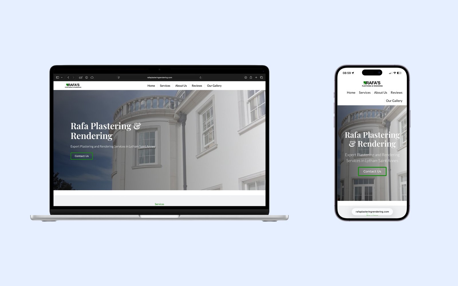 A sample homepage hero showing a plasterer site that sells smooth finishes and tidy work.